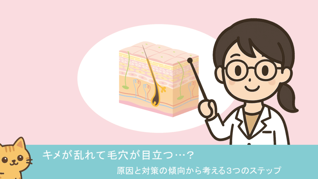 この記事では、「キメが乱れて毛穴が目立つ」という状態に着目し、原因の傾向と対策の考え方を”3つのステップ”で整理していきます。